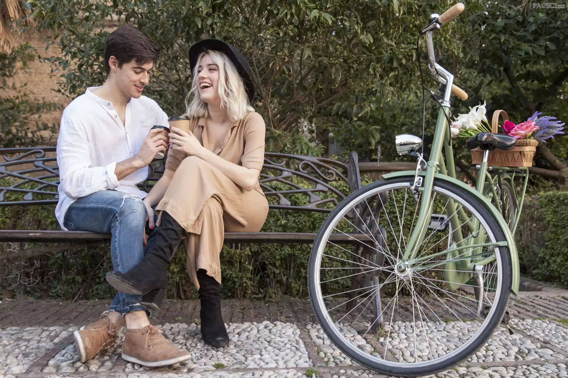 Kapelusz, Kwiaty, Mężczyzna, Ławka, Koszyk, Rower, Uśmiech, Kobieta, Kawa - faceci.biz